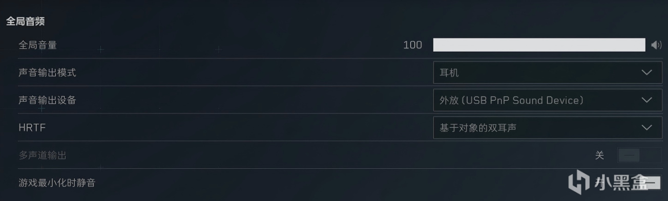 系統設置調節完後,接下來我們進入遊戲。 第一步選擇“音頻”,將聲音輸出模式改爲“耳機”。HTRF 選項是一定要開的,但是是選擇“雙耳聲”還是“基於對象的雙耳聲”呢?搜了網上的很多博主推薦設置,觀點各佔一半,於是我總結了一下:雙耳聲聲音更大,但是上下方位的聲音分辨是劣勢。基於對象的雙耳聲聲音更加細小,但是更容易分辨。目前本人也在用這個選項,所以推薦選擇“基於對象”。