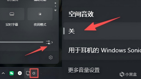 首先就是電腦的系統設置。以 Win11 爲例,左鍵點擊桌面右下加的小喇叭,然後點擊“選擇聲音輸出”,查看你的聲音設備是否關閉了“空間音效”。這個選項對遊戲來說是個負增益,因爲會和遊戲中的音效疊加,關閉後可以讓聲音定位更加精準。