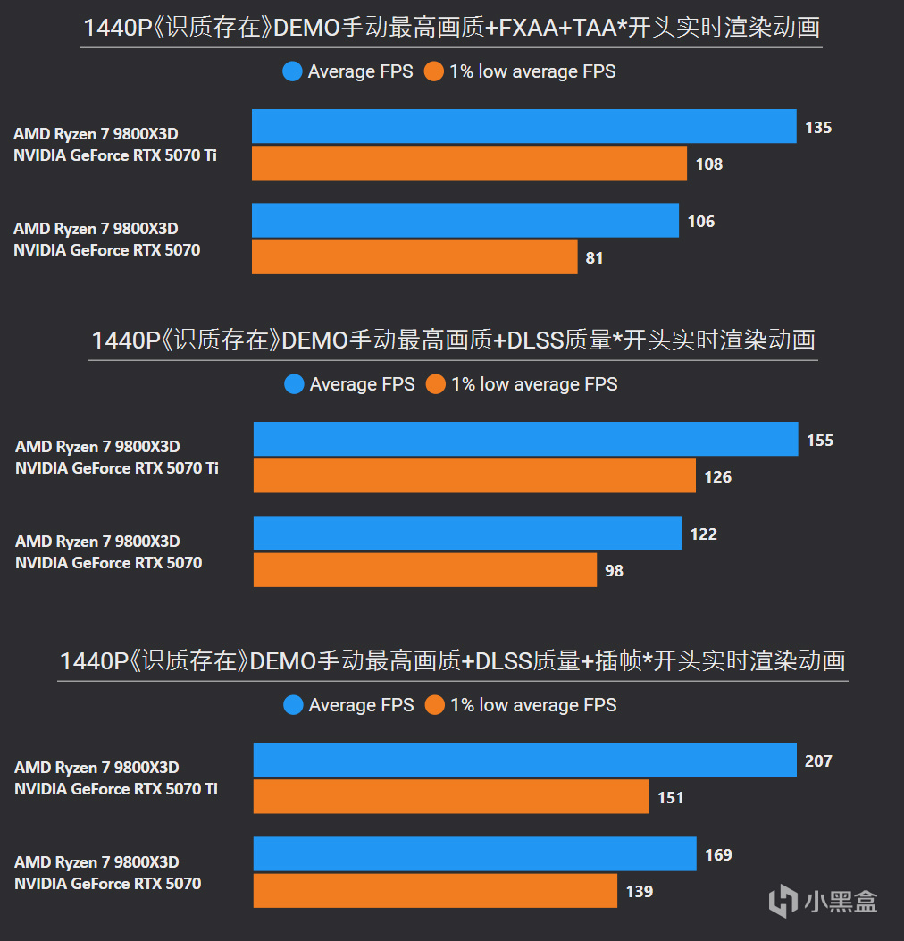 1080P最高画质,在原生情况下RTX 5070刚好能满足144HZ高刷要求,建议是搭配DLSS技术再稳一手。如果要求达到200fps超高帧标准,则需要用到RTX 5070 Ti借助DLSS。不管怎么样,这两款显卡的原始帧远超100fps,大可放心使用插帧。