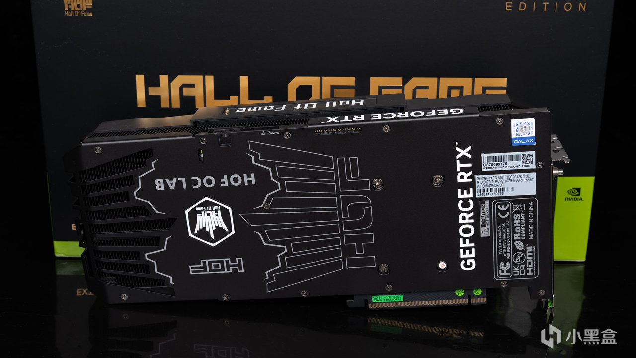 背板区域刻画了相当多的HOF元素,其中标语“HOF OC LAB”尤其醒目,尾部还有“皇冠”造型的镂空散热区域,和风扇可以联动起来形成前后流畅的风道体系。