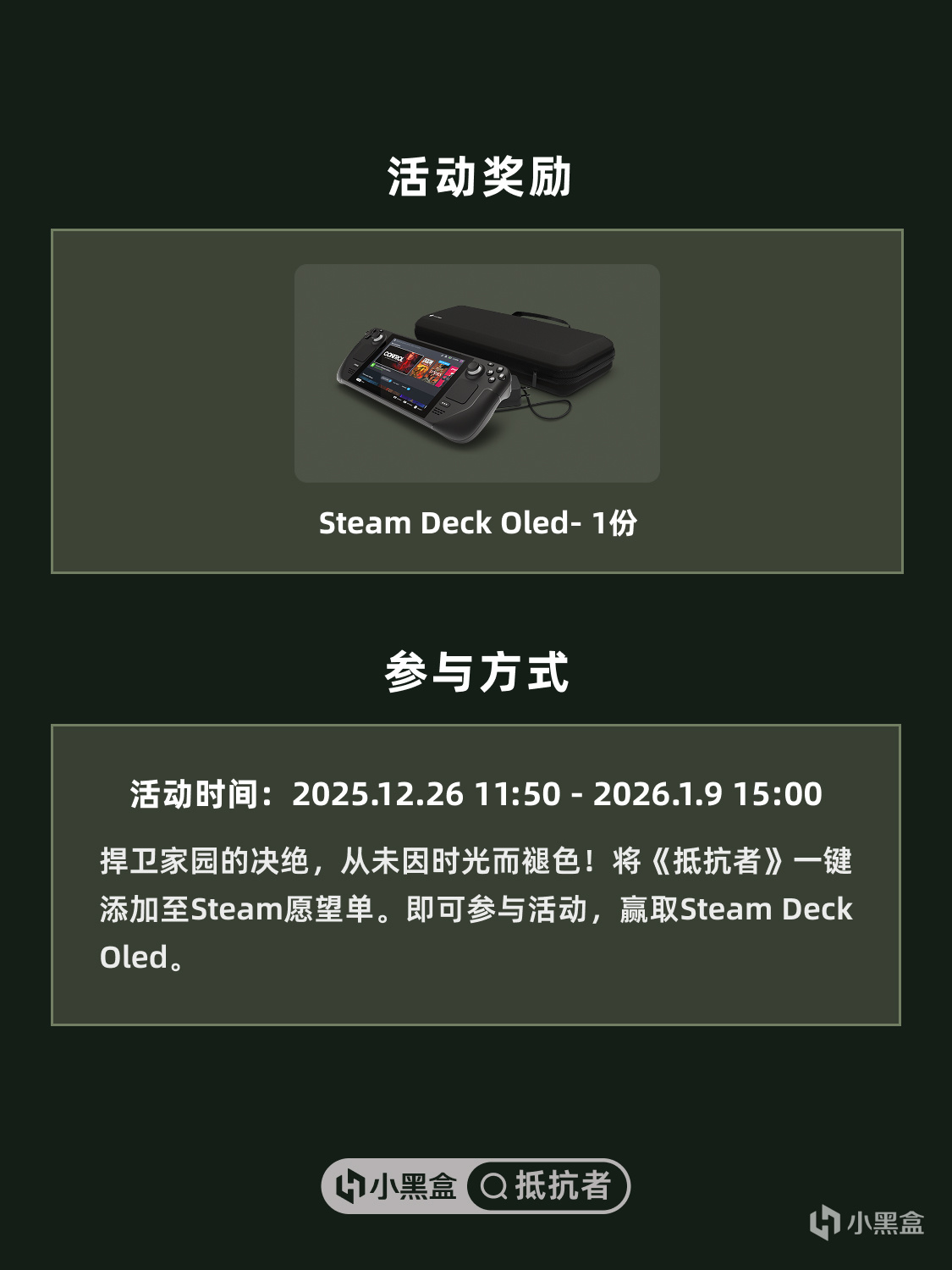 捍衛家園的決絕,從未因時光而褪色。現在,輪到你成爲那段黑暗歲月中的光、成爲歷史本身。 現在將《抵抗者》加入心願單即可參與活動贏Steam Deck Oled https://api.xiaoheihe.cn/store/roll_room_v2?award_id=5541(通過文章中鏈接即可參與)