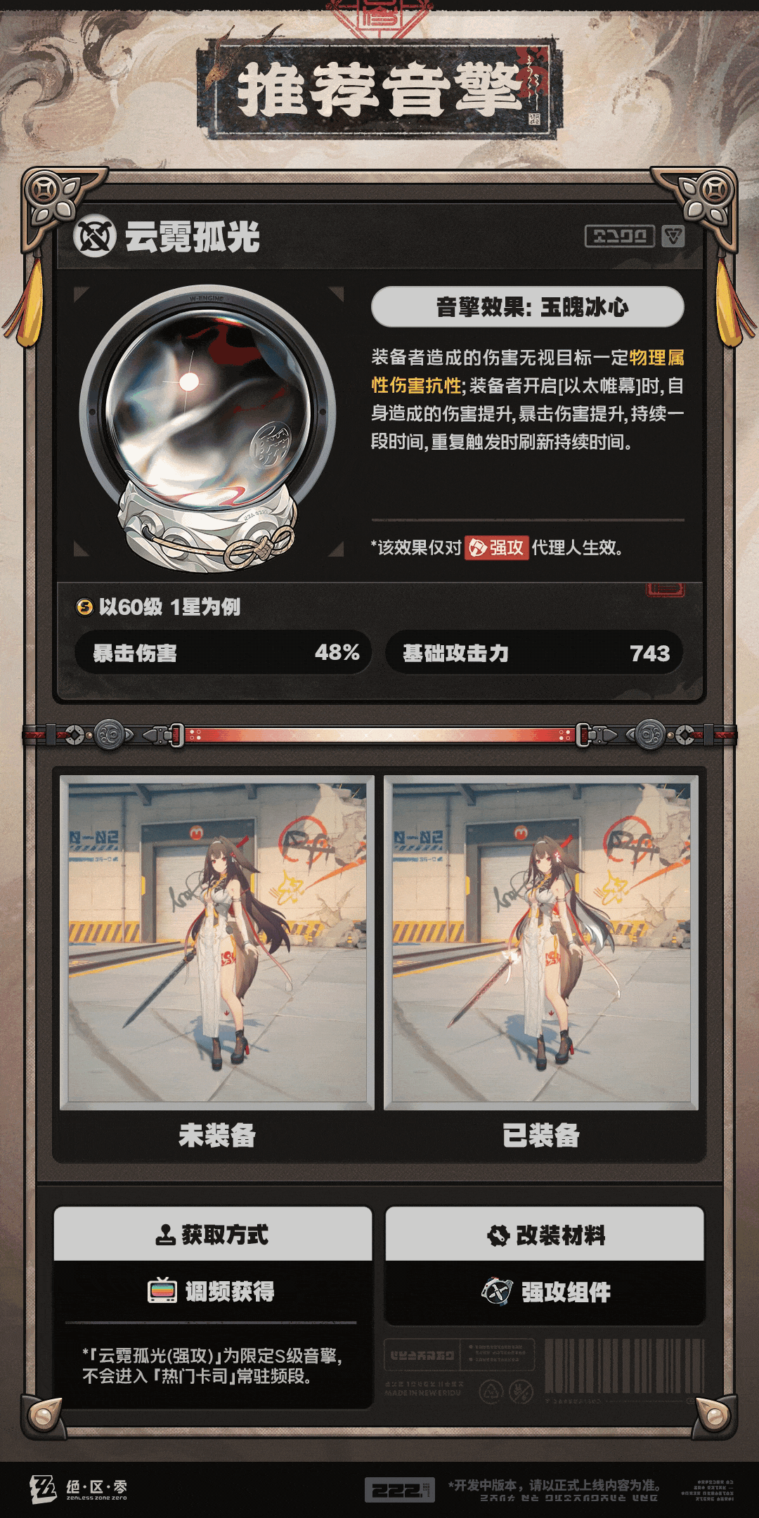 獲取方式:僅能通過調頻獲得,爲限定S級,不進入常駐頻段;核心技消耗材料爲濁紋晶質、高維數據·淬刺蝕芯。