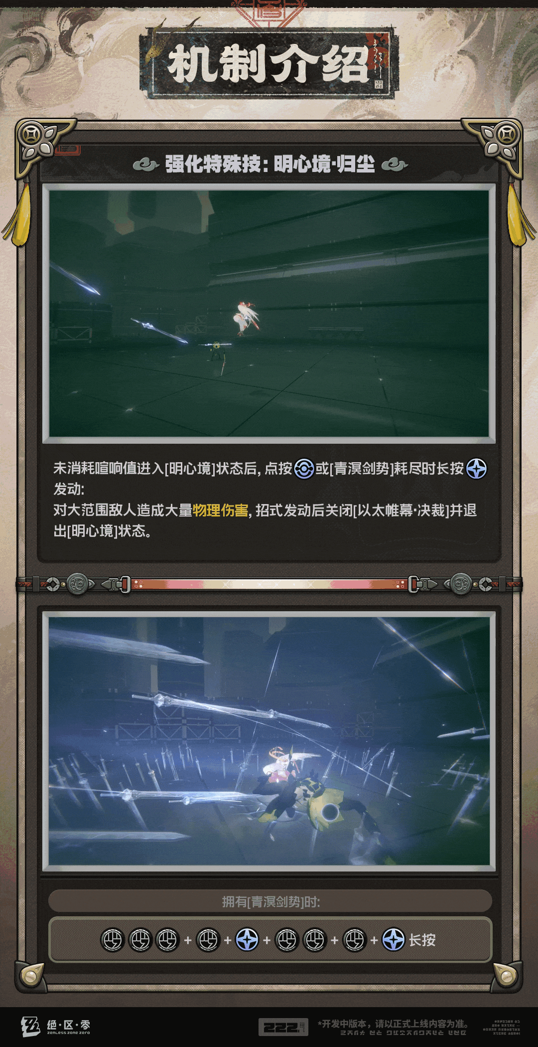 青溟劍勢:最多累積6點,可通過非明心境攻擊、強化特殊技、隊友開帷幕獲取,溢出轉化爲「載物」,退出明心境時「載物」轉回劍勢。