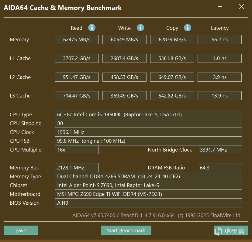 那既然聊到了性能,我们来聊聊这个内存条强大的超频性能吧,当然,汉存本身也算是比较正经的品牌了,所以其默认的XMP并没有设定到4000,而是采用了一个比较稳定的3600频率,这使得几乎所有主板都能开启XMP,而不会直接全黑,但这也使得其性能并不能得到完全的释放,于是在手动超频+Z板+14600K的帮助下,这是其在4266频率下的表现,某种意义上也算是极限了,再超真就变成灰烬植物了