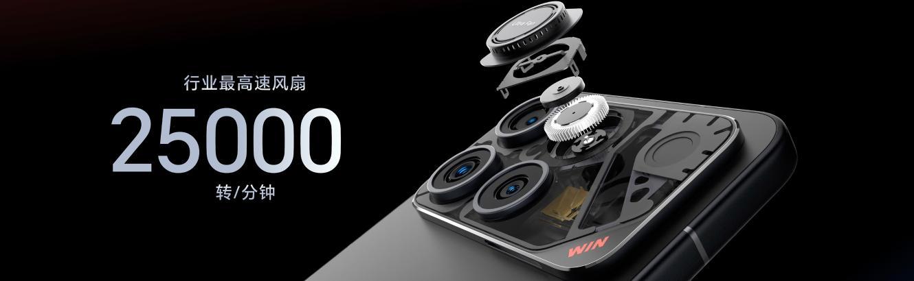 荣耀WIN采用全新风暴之眼Deco矩阵,横向的镜头模组左侧为三摄组合和荣耀东风涡轮散热风扇,右侧为闪光灯和WIN系列标识,荣耀东风涡轮散热风扇每分钟25000转,风道设计在主板上方,配合拓扑设计VC散热板,能有效转移手机热点热量。