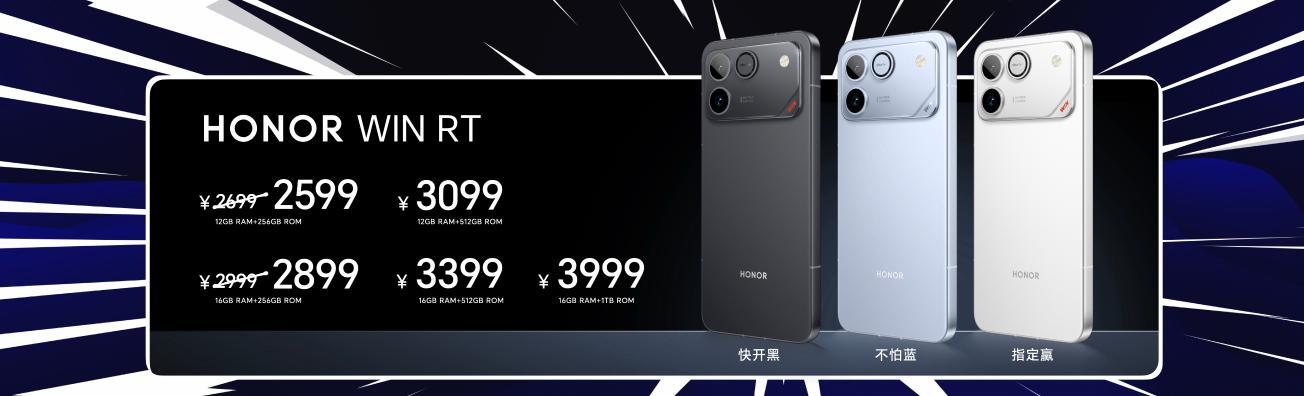 荣耀WIN系列全系采用直屏设计,配备金属中框,厚度8.3mm,荣耀WIN重量为229g,荣耀WIN RT重量为225g,全系三款配色,分别是快开黑、指定赢和不怕蓝。