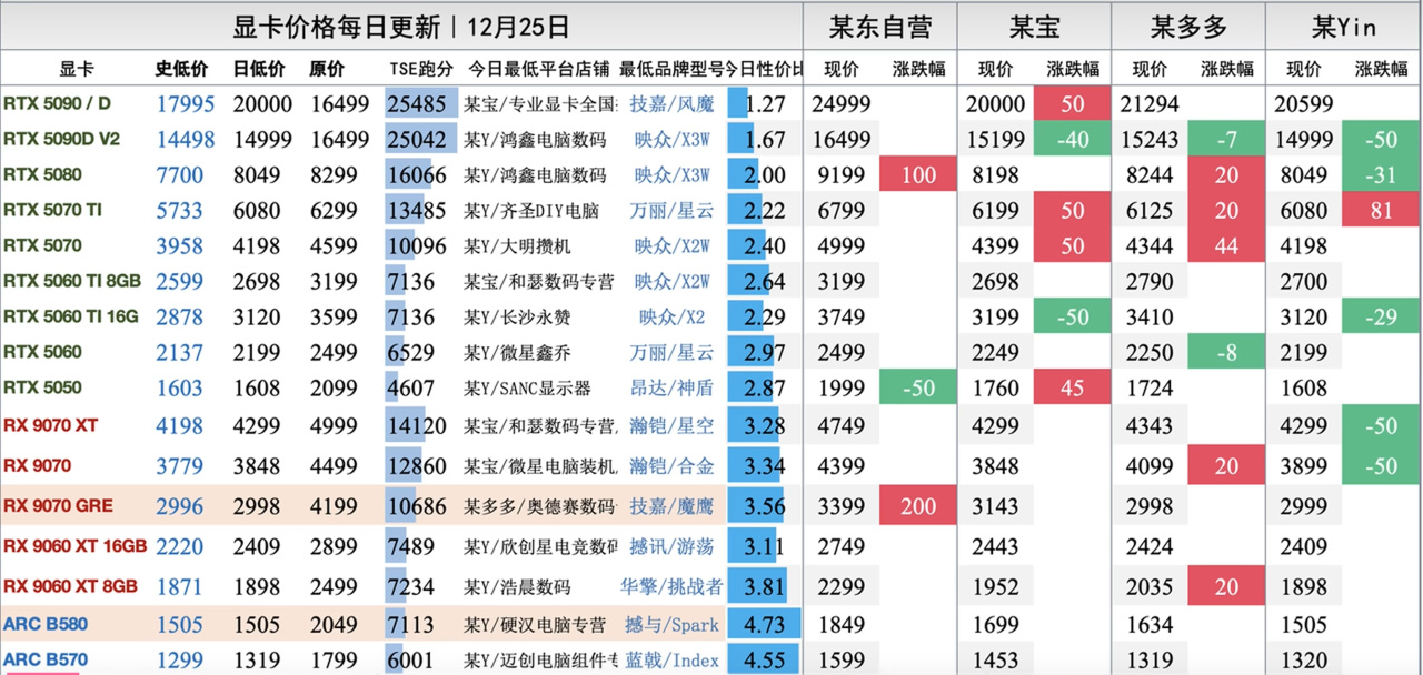 Tips:这里先说好,坚决不制造焦虑,反倒会在某些方面给大家吃颗安心丸!先放一张@芝士华莱士大佬制作的今日显卡价格图。