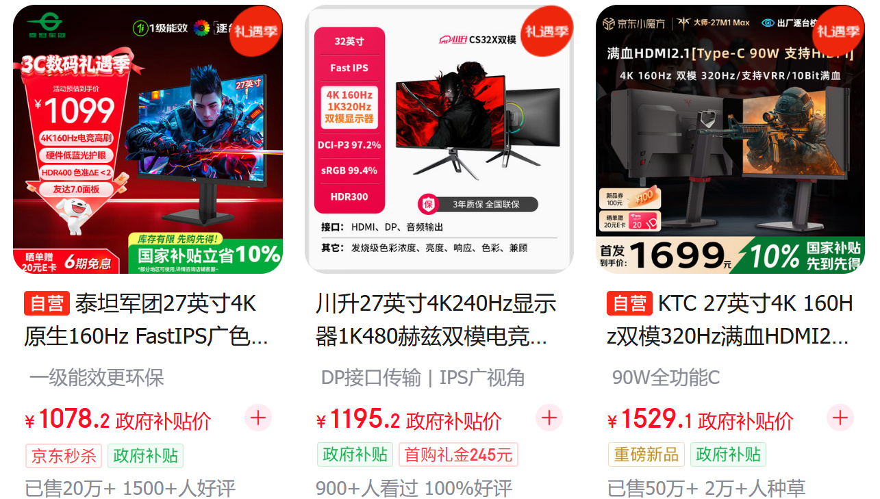 大约1000块钱的预算就能选一台参数还不错的IPS面板4K高刷屏了,甚至还有1K/4K双模的版本,一般玩游戏够用了。