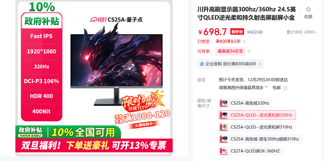 这价位的显示器我看了一圈,川升CS25A的QLED量子点就很合适。首先是+100元,即可获得320Hz+QLED,最重要的是,它居然还给到出厂校色,这玩意儿才卖699块,电竞之余玩玩3A也完全没问题。