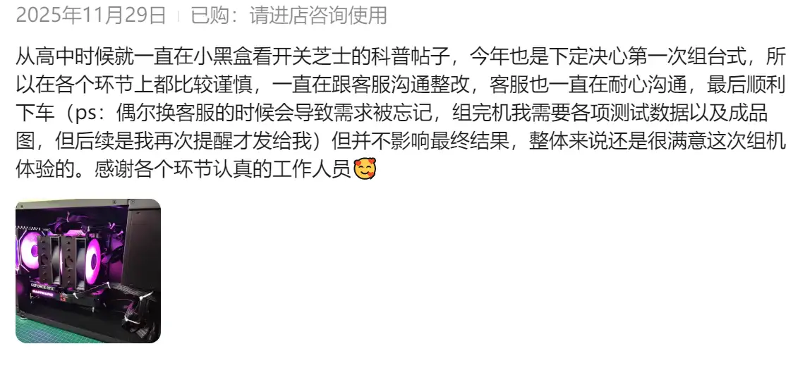 当然即使如此也不能完全避免翻车。只能保证万一翻车了,第一时间给老哥们解决问题,之前遇见过相关实例,详见:卖给新疆粉丝的电脑,机箱被摔成了渣