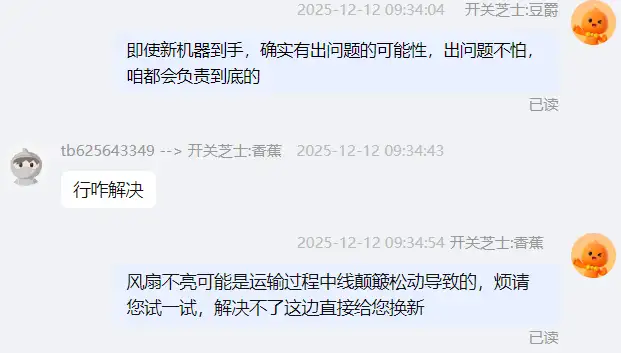 即使如此,新机器到手依旧有概率出现死机、蓝屏、异响等问题。一般是运输颠簸导致内存、线路等松动,当然,这个时候客服会顶上,耐心帮顾客排查问题: