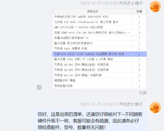 接着把出库清单发给粉丝检查一遍,确认无误后就可以准备调货安装了