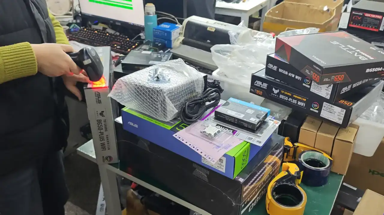 他们家电源包装表面一直没有喷绘SN码,导致每次收货后,都要叫上客服伙伴、配合库房大姐一起拆包装,然后再扫产品表面的SN码入库: