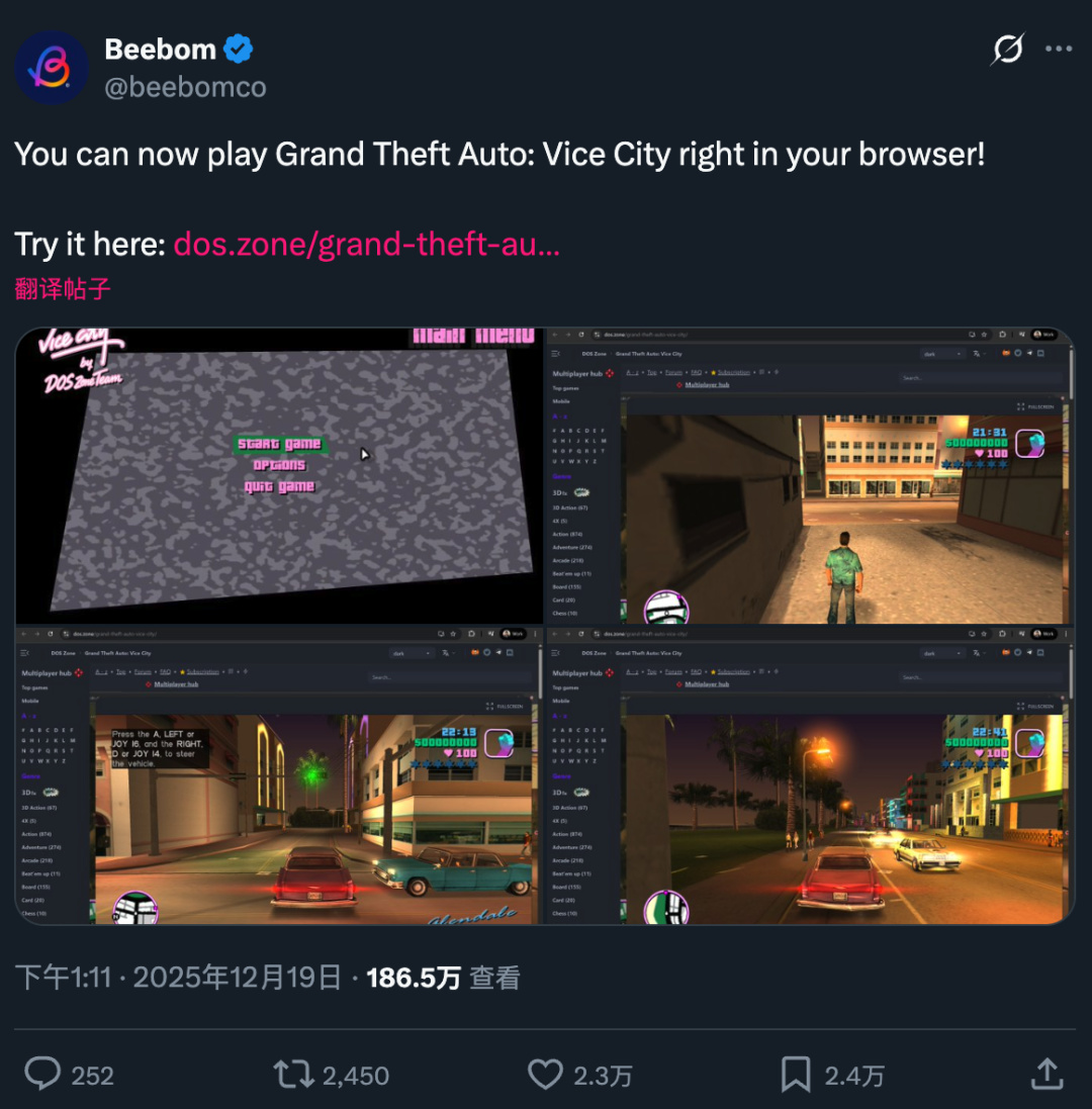 雖然 reVC 官方 GitHub 在幾年前就被下架了( R 星出手 ),但好在 Internet Archive 和其他 GitHub 分支有備份,所以 DosZone 團隊這次才把 reVC 編譯成 WebAssembly 版本,然後重新設計了渲染、輸入、音頻、文件讀取這些底層系統,讓它能在瀏覽器裏流暢跑起來。