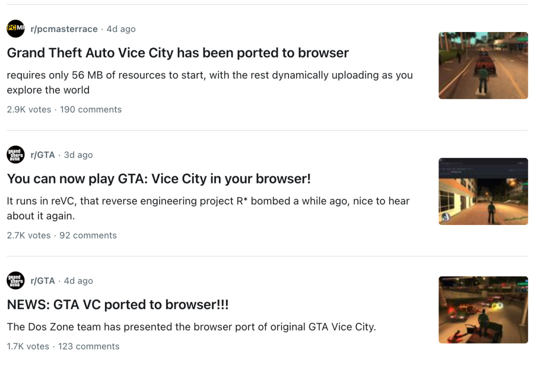 比如罪惡都市網頁版,靠的就是一個叫 reVC 的大神項目。