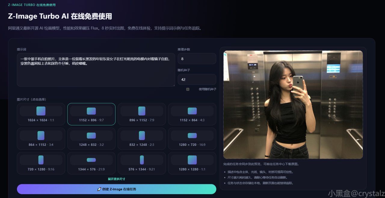 可自定義推理步數、隨機種子、圖片尺寸,8 秒快速出圖。