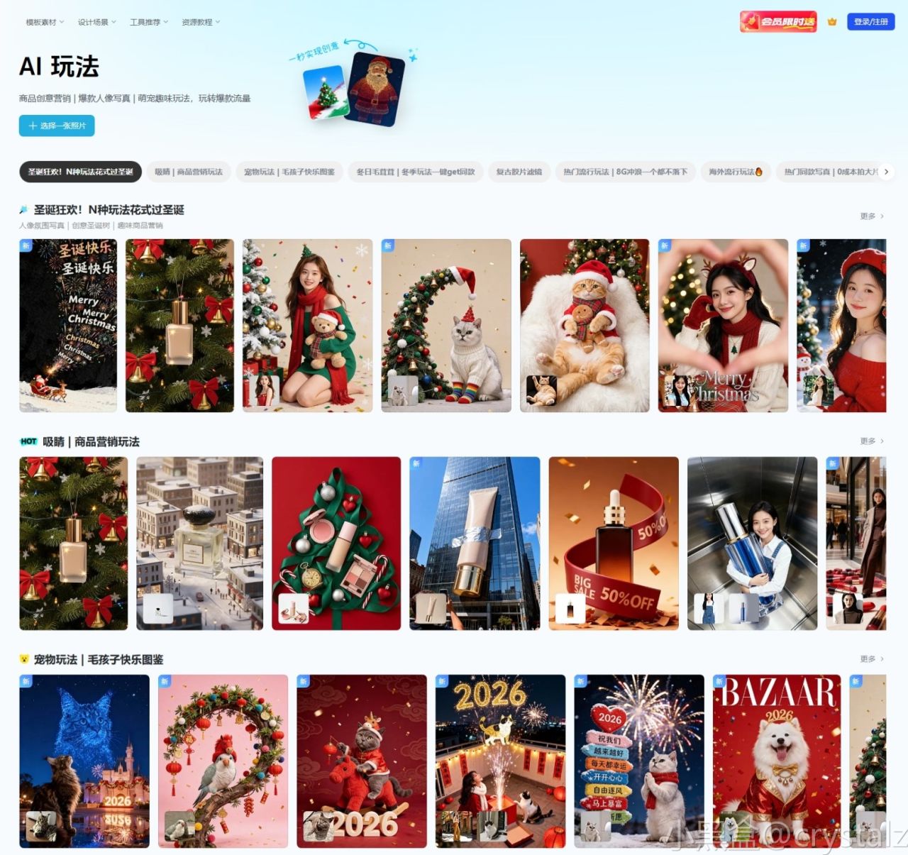 涵蓋花式節日、商品營銷、人像寫真、趣味萌寵、表情包、創意合拍等 N 種玩法,緊跟熱門爆款。