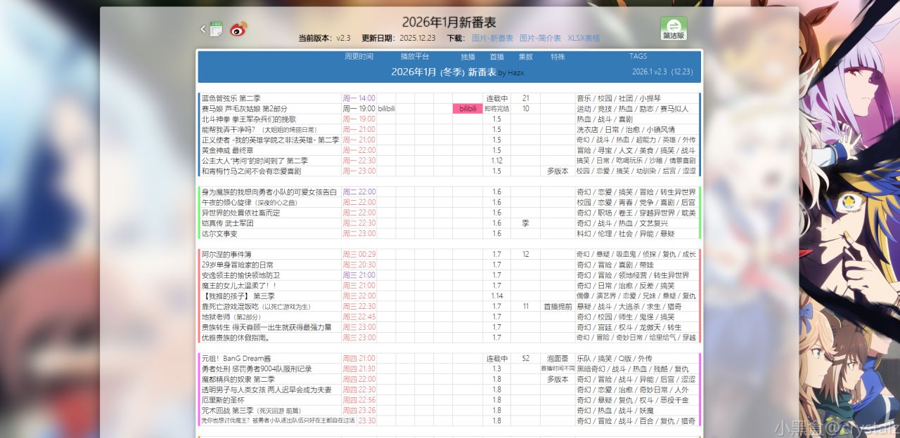 有詳細版和簡潔版可切換,支持下載圖片版、簡介表和 XLSX 表格,方便收藏查閱,看番必備。