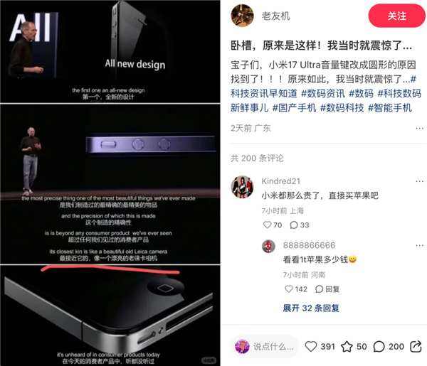 话说当年乔布斯在发布会上介绍 iPhone 4 外观设计的时候,也曾提到过 iPhone 设计得很精致,像一台漂亮的老徕卡相机,而小米这台又是徕卡版,好好好,这下一切就都说得通了。。。