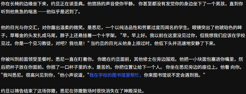 回到探索完神殿上,此时观察时间,如果时间在11:00-13:00可以参加一次弥撒,弥撒可以增长大量纯洁,如果还没有见过悉尼,则可以触发在神殿的初遇。