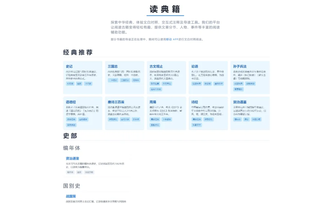 这是是一个专注于古籍阅读与学习的在线平台,汇集了大量中国古代经典文献,涵盖经、史、子、集四部,支持在线阅读、原文与白话对照、注释查询、朗读等功能。