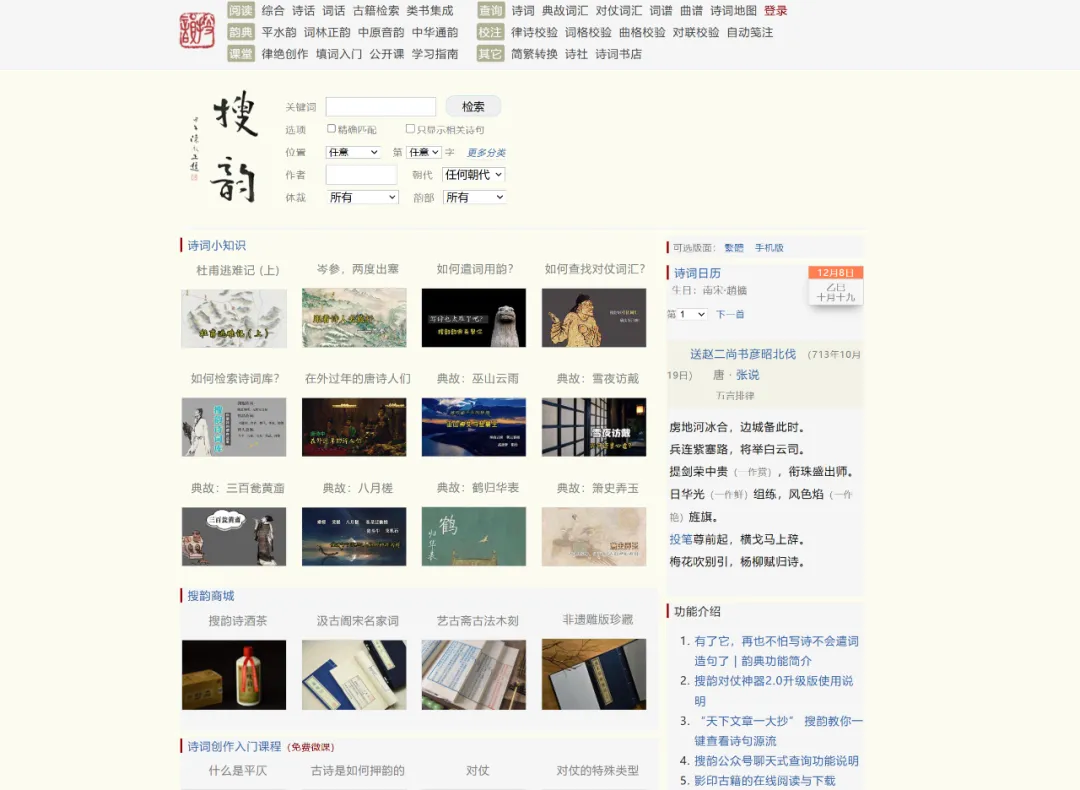 网站提供“智能作诗”“对句生成”“平仄检测”“押韵校验”“意象检索”“古籍原图对照”等20余项在线工具,支持全文检索、高级筛选、字词释义、格律教学、专题考试与创作打卡,被为“掌上诗词图书馆”。