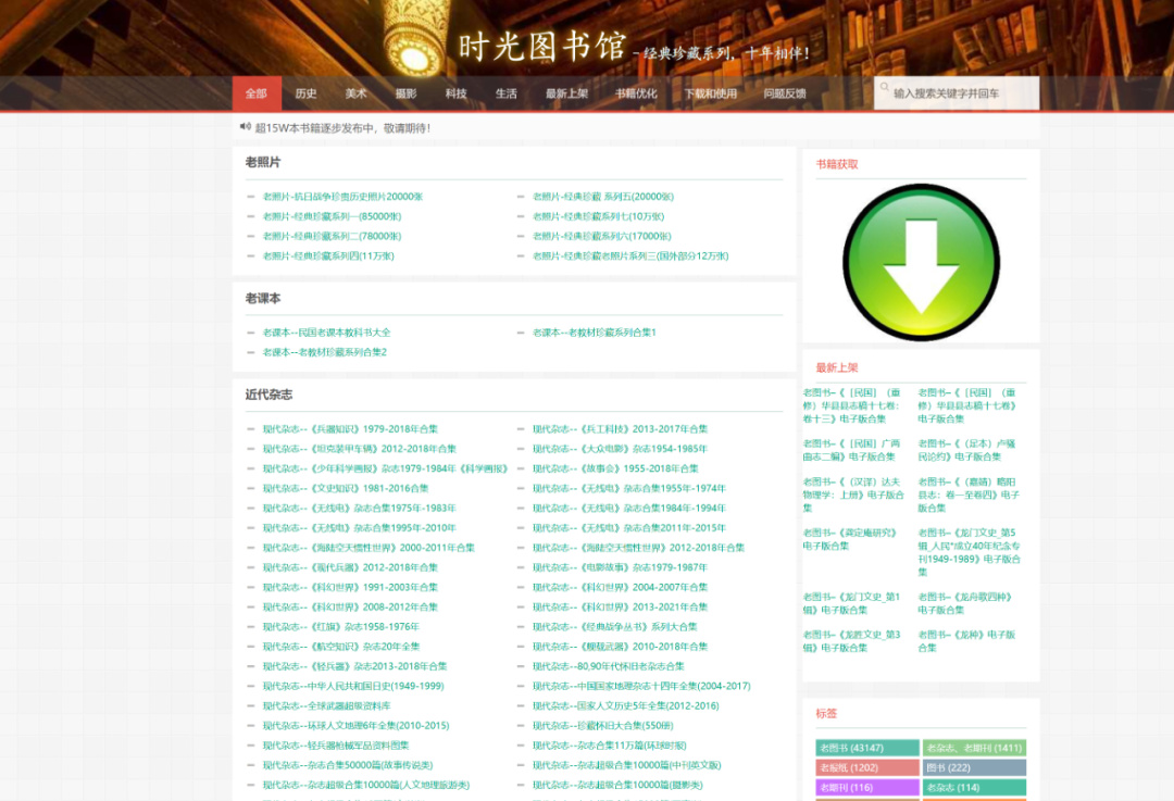 一个致力于收藏和分享经典珍贵资料的个人网站,已持续运营十年。网站目前正以逐步发布的形式,分享超过15万本珍贵书籍、老照片、老课本、近代杂志、连环画、古籍、书画、乐谱、摄影、游记、文学、县志、漫画、老报纸和老期刊等资源。