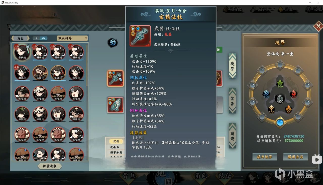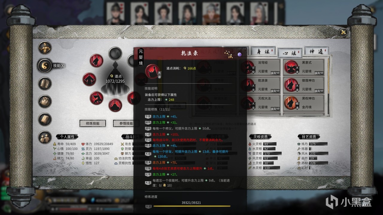 角色属性包含寿命、灵力、功法资质等多维度,技能品质从白到红逐级提升,数值与词条效果同步增强。