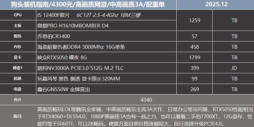 狗头装机指南 / 4300 元 / 高画质网游 / 中高画质 3A / 配置单