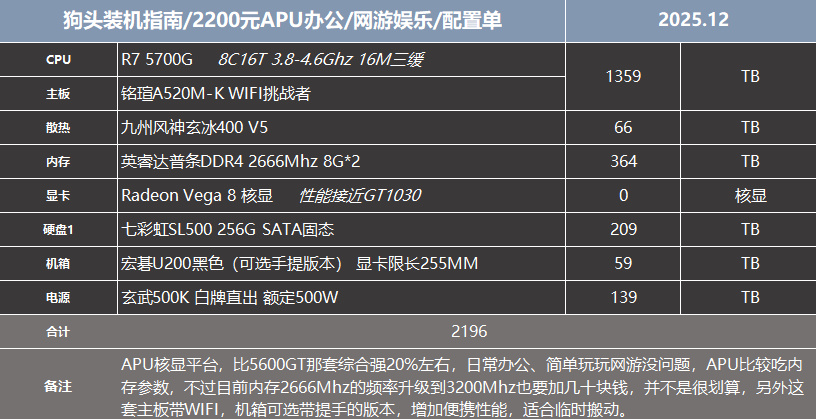 狗头装机指南 / 2200 元 APU / 办公 / 网游娱乐 / 配置单
