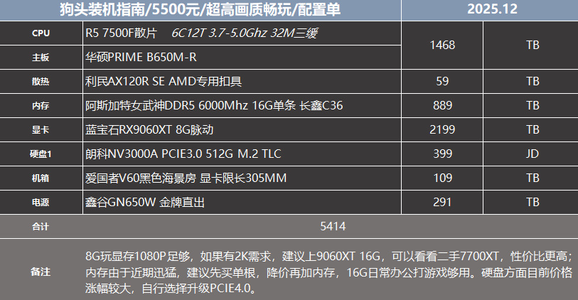 狗头装机指南 / 5500 元 / 超高画质畅玩 / 配置单