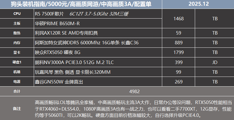 狗头装机指南 / 5000 元 / 高画质网游 / 中高画质 3A / 配置单