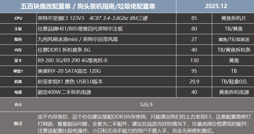这套是实打实的 “老将” E3 平台,E3 123V3应付简单办公和网游基本够用,成本压到了五百出头。全套都是二手配件,有一定操作门槛,小白和没动手能力的误入,适合有折腾能力、想花最少钱凑台应急机子的垃圾佬们。