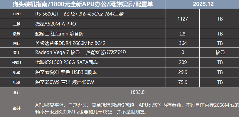 狗头装机指南 / 1800 元全新 APU / 办公 / 网游娱乐 / 配置单