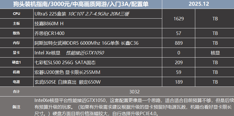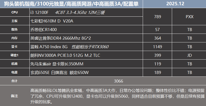 狗头装机指南 / 3000 元 / 中高画质网游 / 入门 3A / 配置单