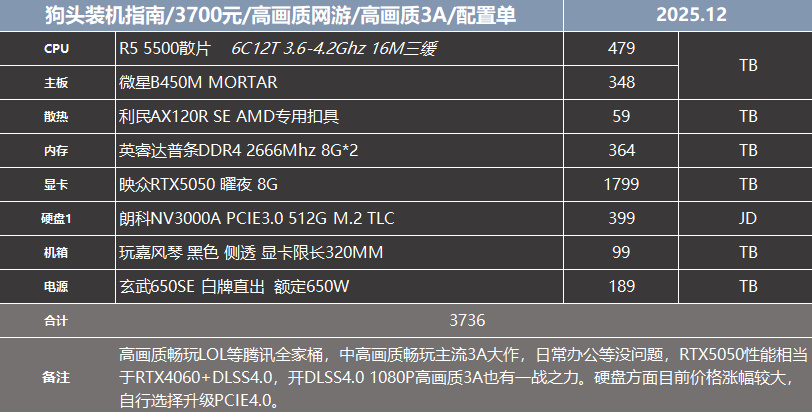 狗头装机指南 / 3700 元 / 高画质网游 / 高画质 3A / 配置单