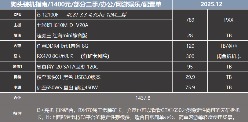 狗头装机指南 / 1400 元 / 部分二手 / 办公 / 网游娱乐 / 配置单