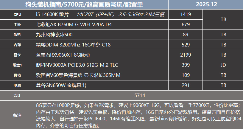i5 14600K 散片,14C20T的性能规格,游戏多开和复杂多任务都能驾驭,虽说有缩缸风险,但新 BIOS 可以缓解部分这个问题(目前在用的i9 14900KF刷了新bios之后已经稳定使用快一年了),可以用上便宜的 D4 内存,显卡搭了蓝宝石 RX9060XT 8G,1080P 超高画质畅玩完全没压力;要是有 2K 需求(吧啦吧啦省略一百字)适合主流预算区间、追求1080P超高画质体验的用户。