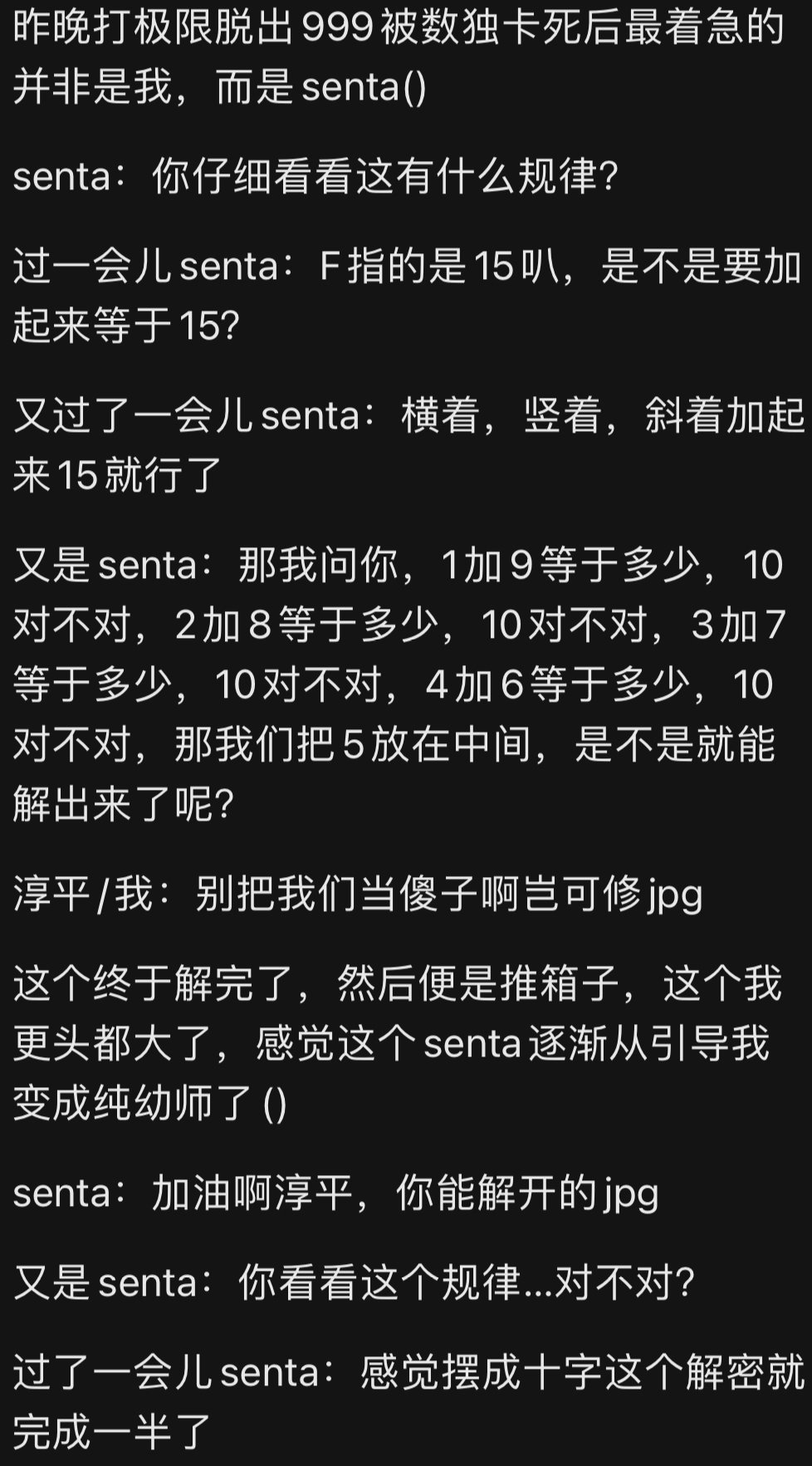 極限脫出999作爲解密遊戲沒有像推理遊戲一樣的推理互動,但如果玩家解密解不出來是會有隊友來給你提醒的,並且是那種很符合人設的對話變相提醒