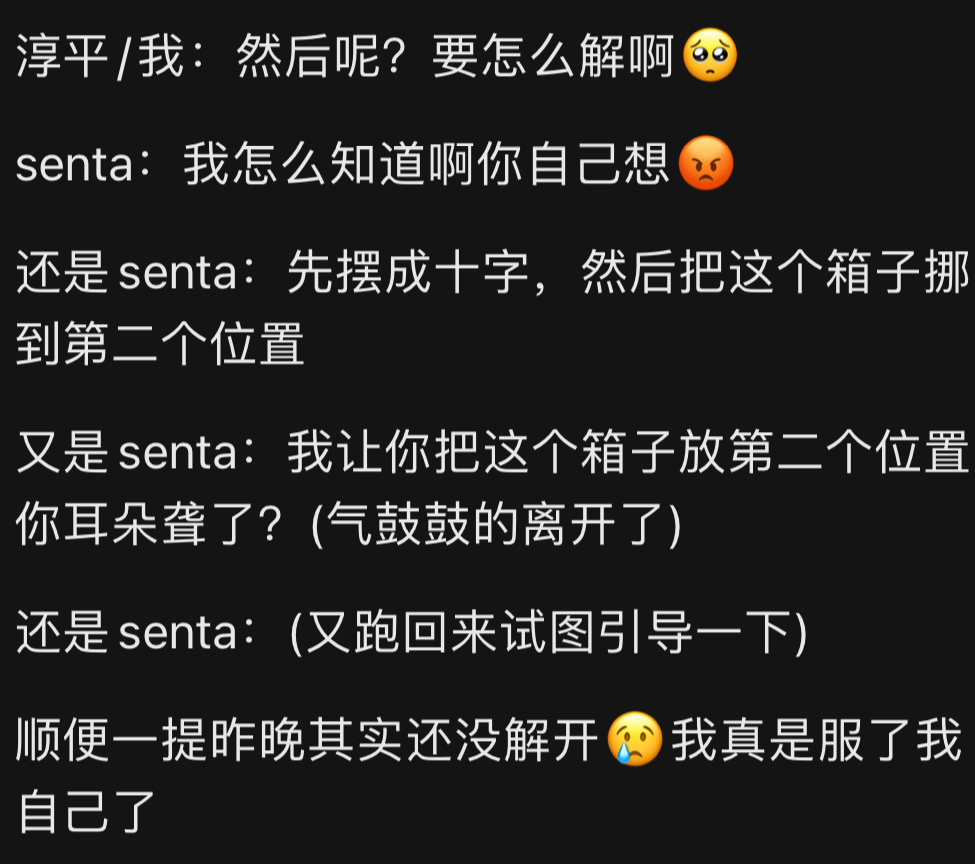 這裏面有個綠毛設定應該是傲嬌+暴躁老哥的那種,他有個哥哥,且是非常經典的十全十美極致亞撒西的那種好哥哥,背景也是非常經典的父母更愛優秀的哥哥而忽視壓力綠毛,綠毛一直活在完美哥哥的陰影下過得很痛苦,也漸漸地開始恨自己的哥哥,哥哥想改變現狀不想讓弟弟這樣,於是他決定,紫砂😨他覺得只有自己死了弟弟才能過得好,然後他真的不管自己的親朋好友直接跳了我一個大震撼。在遊戲裏我們走綠毛的線靠解密和觀看他的回憶得知了這件事的真相後,哥哥的幻影會出來要跟我們進行對話,就是他會一直說話,然後我們選擇選項回答他提出問題,這裏面的第一個問題我記得是他問綠毛他是幾歲打遊戲打贏了哥哥的,選項是他不同的年齡段,這裏選對了就繼續對話,除了正確選項無論選哪個選錯了他會說“這纔剛開始呢,慢慢來”然後扣血重選。拿這個對話爲例子打個比方,這裏的話換做是我,選錯了我就會換一個這樣子的對話