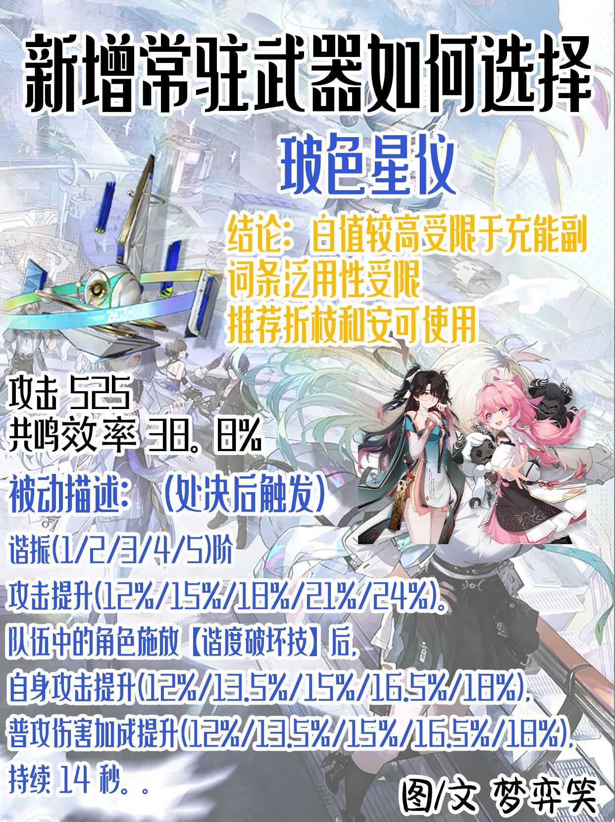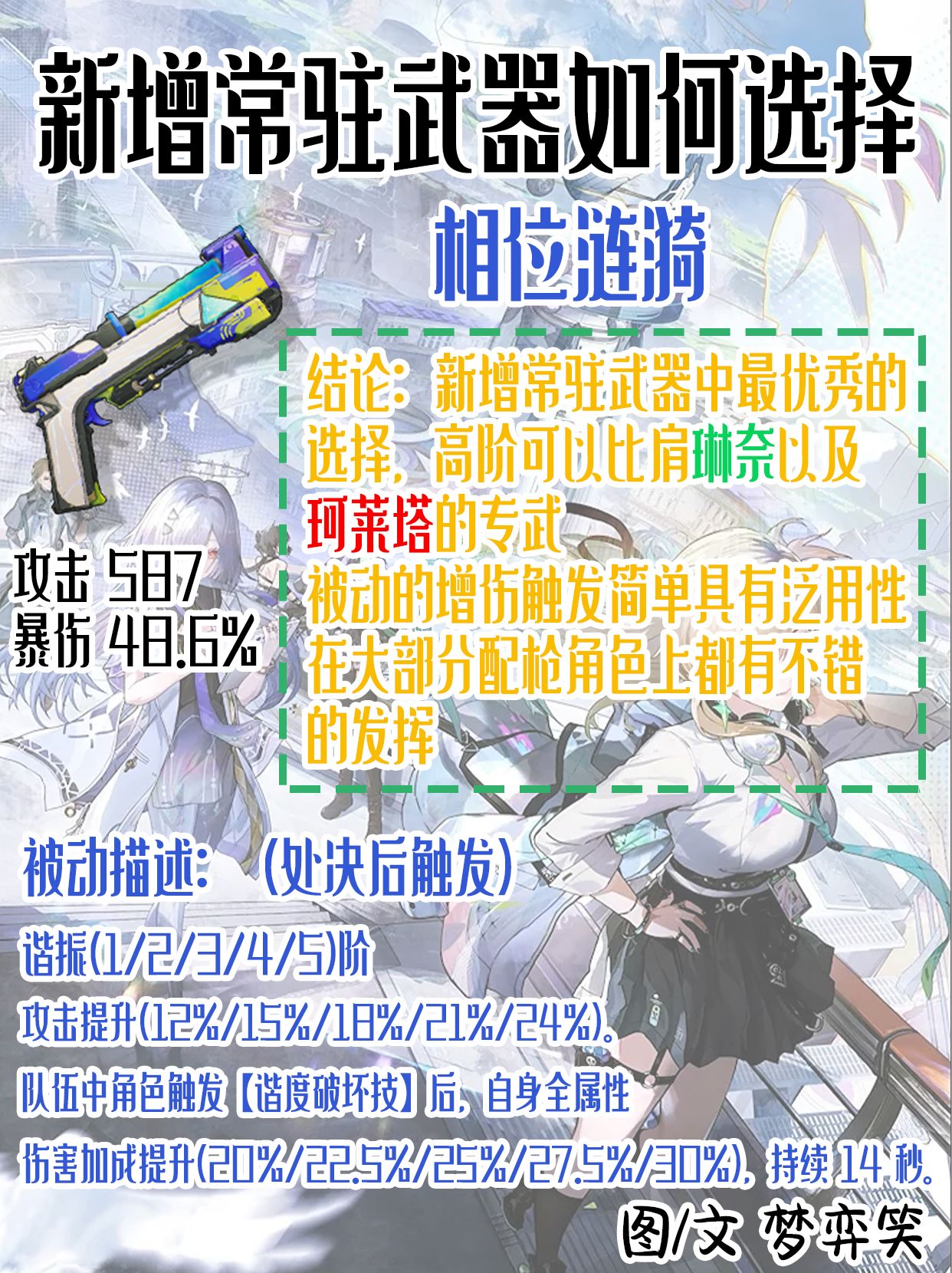 配枪 相位涟漪表现超乎预期,具有之前旧迅刃的泛用性,有珂莱塔的漂泊者可以节约资源,使用该武器替代,省出一把专武的资源,提供给更有需要的角色。