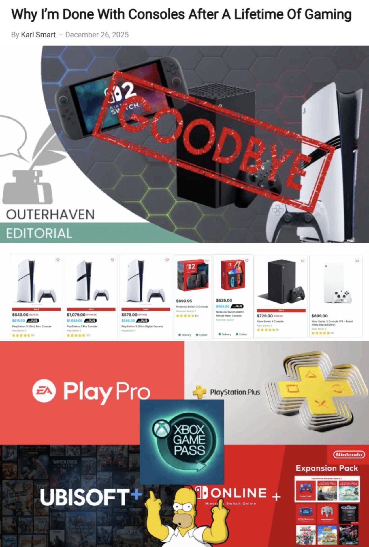 Smart從世嘉SC-3000時代開始玩遊戲,橫跨多個主機世代。他指出,近年來遊戲行業呈現“價格不斷上漲,但體驗升級有限”的問題,主機平臺受到高成本、限制增多和滿意度下降的衝擊尤爲明顯。他對遊戲分版本銷售和訂閱制服務表示強烈反感,認爲這些做法削弱了玩家的“擁有感”,是對消費者的不尊重。他還特別對Switch 2用戶協議中“可使主機失效”的條款表示擔憂。相比之下,PC平臺更自由、靈活,擁有頻繁折扣、MOD擴展性和多任務處理等優勢。Smart強調,儘管對遊戲本身的熱愛未減,但他已找不到繼續當“主機玩家”的理由。