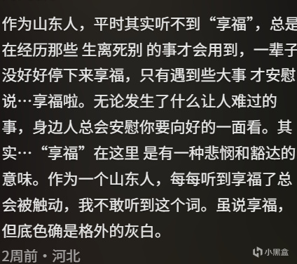 好心態決定山東人的一生,別人是沒福硬享,山東人是指苦爲福。“山東人人均哲學大師,享福這個詞就像是山東人自己的‘來都來了’‘大過年的’‘都是孩子’,就算遇到天大的糟心事兒,也能被這句享福安慰得服服帖帖。”