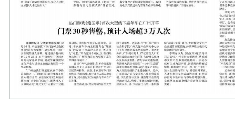 作为华南地区极具影响力的主流媒体,《羊城晚报》此次打破传统报道模式,于12月26日A8版推出《新艾利都城市快报》特别版面,将游戏内虚构的报纸实体化呈现,全景式报道FES落地广州的盛况、粤文化融合亮点及30秒门票售罄的热度,该版面迅速在玩家社群引发疯抢,电子版被广泛转发,淘宝相关打印商品单日销量破千份 。