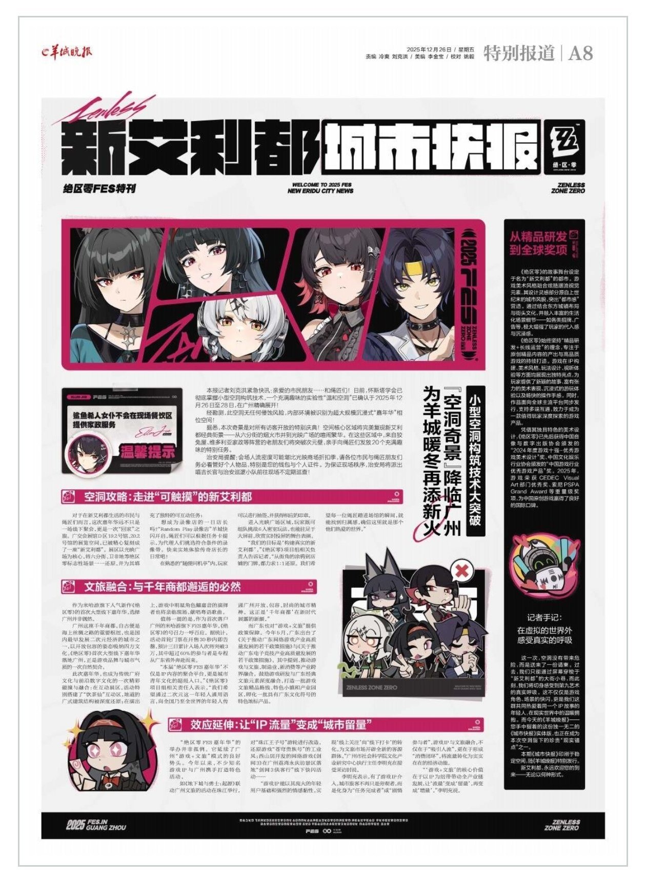 从虚拟报纸的实体化呈现到三天密集的音视频报道,《羊城晚报》对《绝区零》FES的全方位聚焦,不仅记录了一场游戏嘉年华的狂欢,更见证了数字文化成为城市文旅新动能的产业趋势,为游戏IP与地域文化、主流媒体的深度融合提供了鲜活样本。