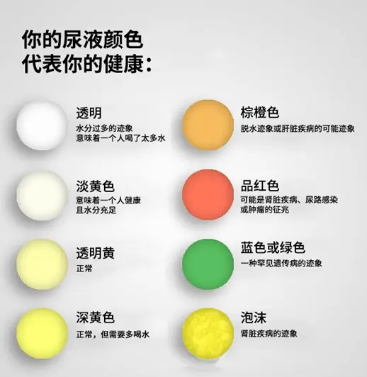 看颜色,养成看尿液颜色的习惯。健康的尿液应该是清亮、淡黄色的。如果颜色深了,就是在催你去喝水!