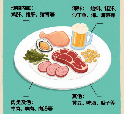 尿酸是嘌呤代谢的产物。海鲜、动物内脏、浓肉汤 都是高嘌呤食物。啤酒既含有嘌呤,酒精又会阻碍尿酸的排泄。