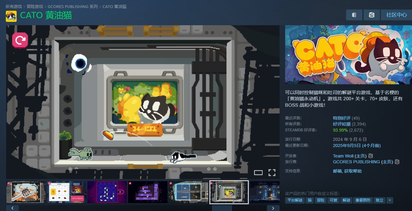 2D像素風平臺解謎遊戲。本作設計靈感來源於“黃油貓咪永動機”網絡meme,謎題設計也基於此:貓咪只能左右移動,黃油只能左右彈射,當貓咪跟黃油結合後,就能突破物理法則,實現不限次數的翻滾浮空。