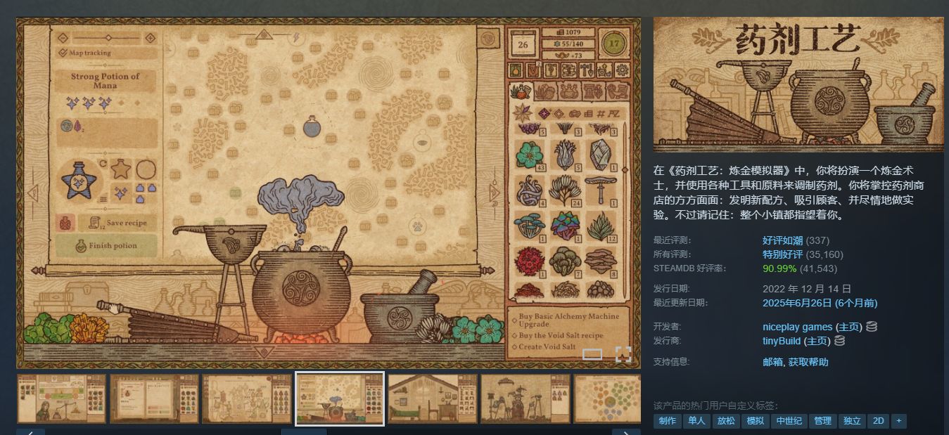 遊戲的整體藝術風格彷彿相互交疊的羊皮卷,中世紀風格的音樂雖然無限循環,卻也並不膩人,算是迄今爲止最能還原筆者對魔藥學期待的鍊金模擬經營類遊戲吧。
