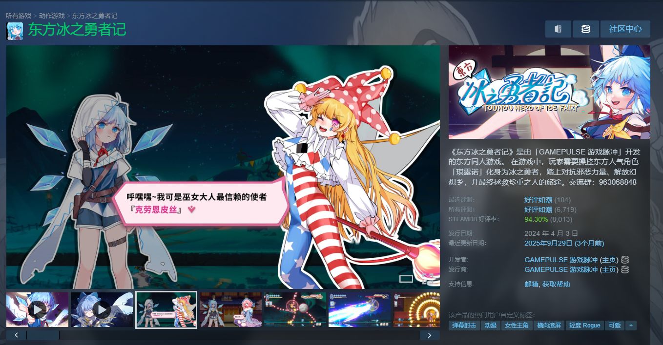 由遊戲脈衝開發的東方同人彈幕射擊遊戲,玩家將控制居住在霧之湖湖畔的、勇敢但腦袋不太靈光的冰之勇者琪露諾,爲了拯救被緋紅魔影抓取的霧之湖公主而開始冒險之旅。遊戲採用的是BOSS RUSH的模式,難度方面還是有的,不過對於車萬玩家來說應該都是小事。